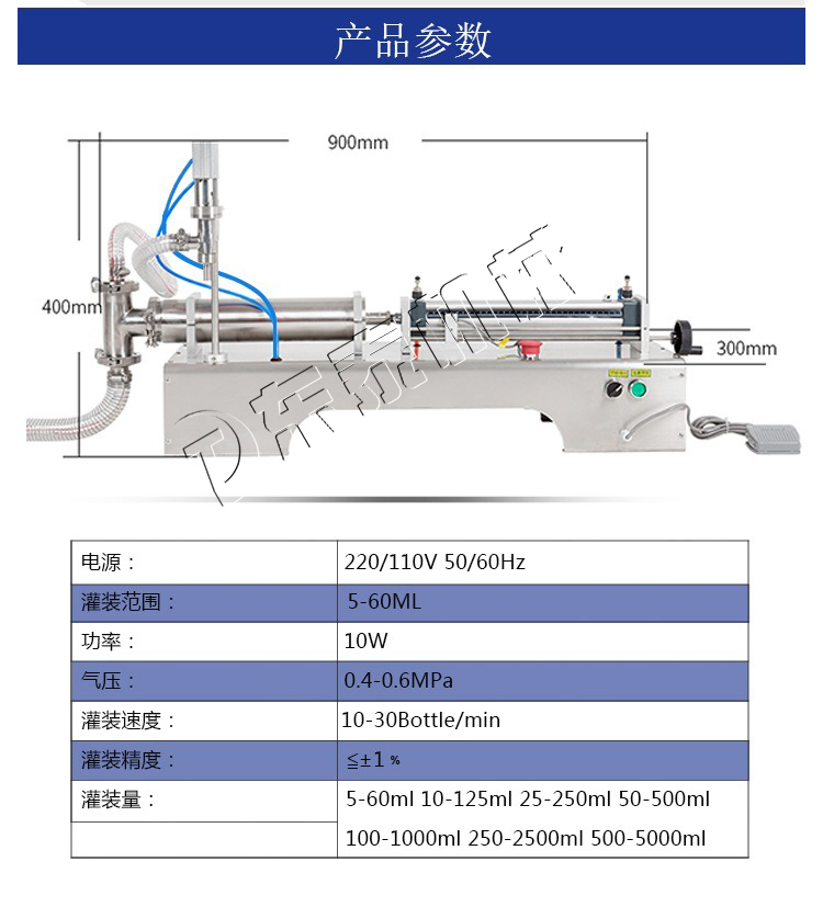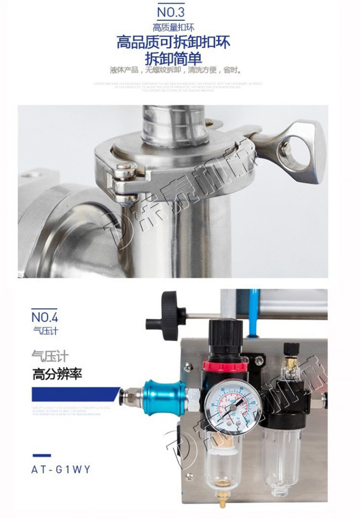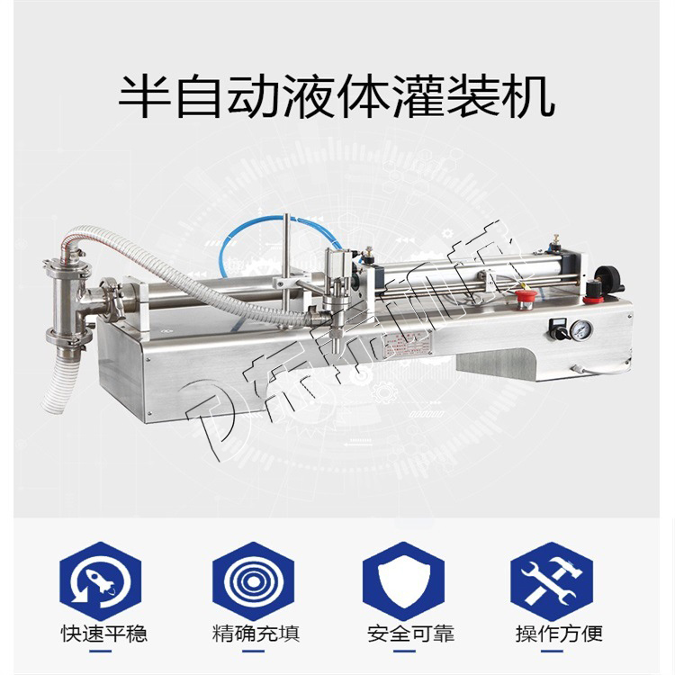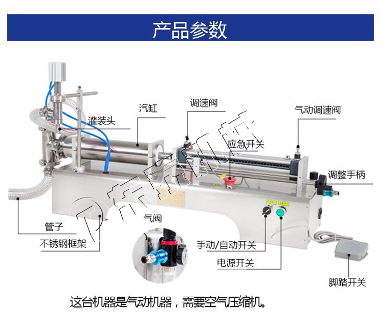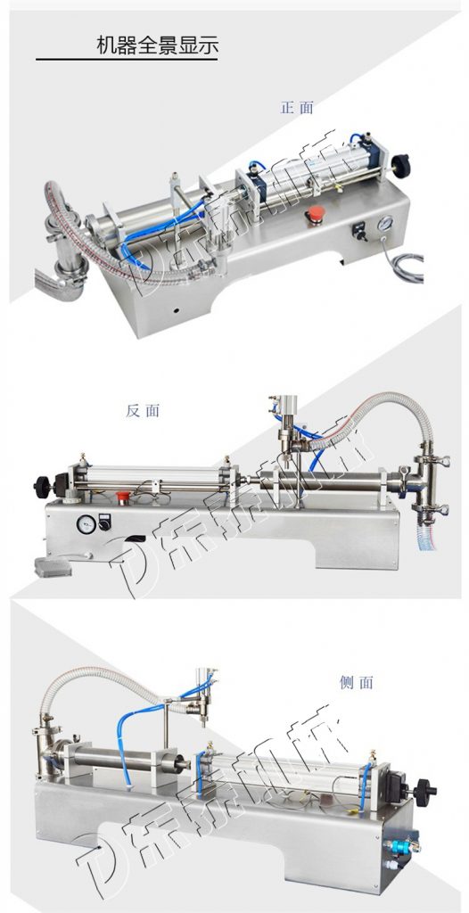 小型液體定量灌裝機,通過氣缸帶動一個活塞來抽取和打出物料,用單項閥控制物料流向,小型液體定量灌裝機用磁簧開關(guān)控制氣缸的行程,即可調(diào)節(jié)灌裝量。